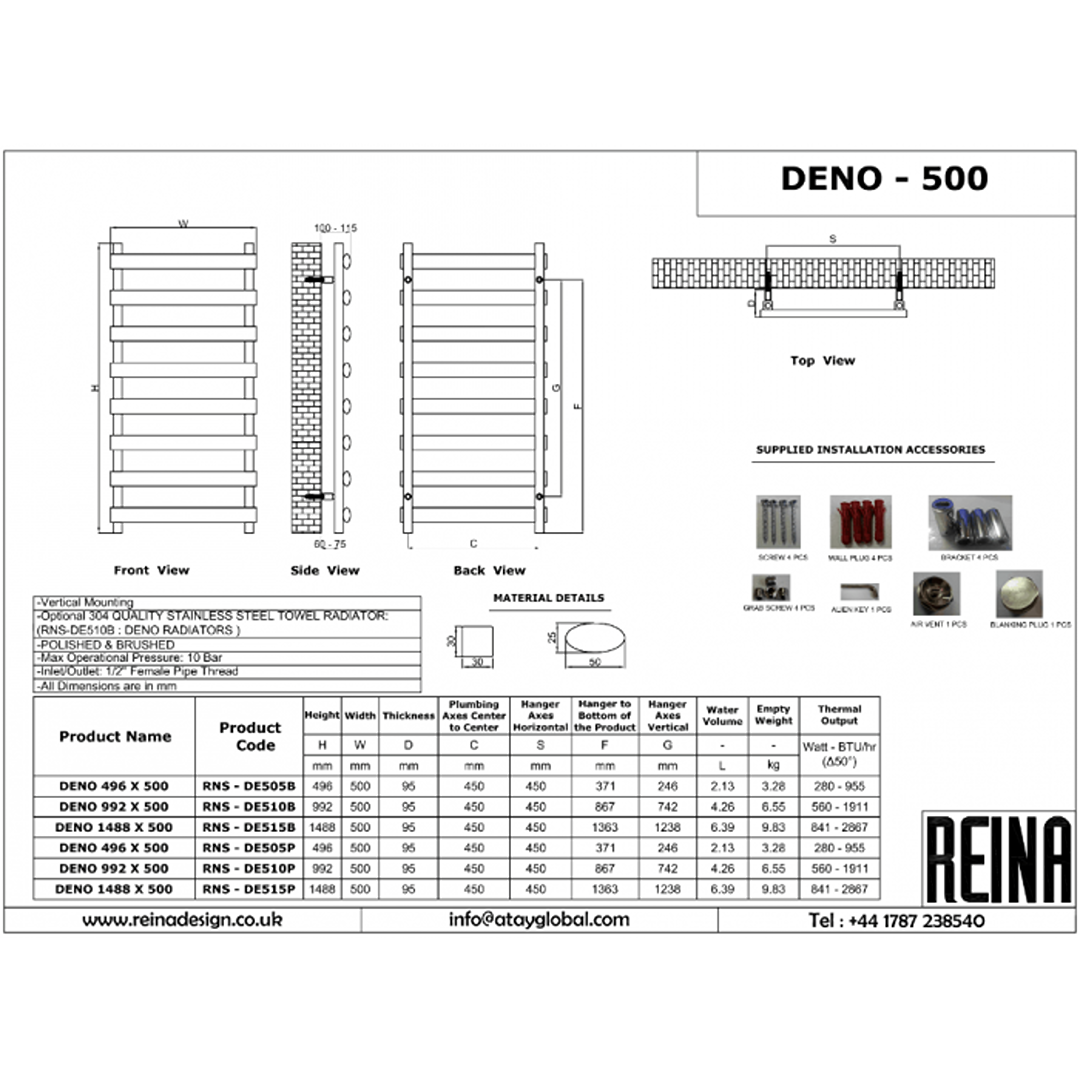 Established in 2005, Reina has taken in industry by storm, consistently creating high-end radiators that combine the newest in functionality with the latest trends and styles. Known for their high quality constructed towel radiators, aluminium radiators and vertical radiators, they offer every customer a hot upgrade from your old radiators. Reina is commited to offering the best stanards in heating for retail and comercal buildings, thanks to their premium materials and exceptional crafting skills theyre able to offer impressive heat outputs and and bring warmth to extra large spaces. Reina offers a wide range of radiators in various styles, shapes and sizes so be sure to choose reina to heat your space. Also available as: Reina Deno Electric Stainless Steel Towel Radiator- Vendor Reina