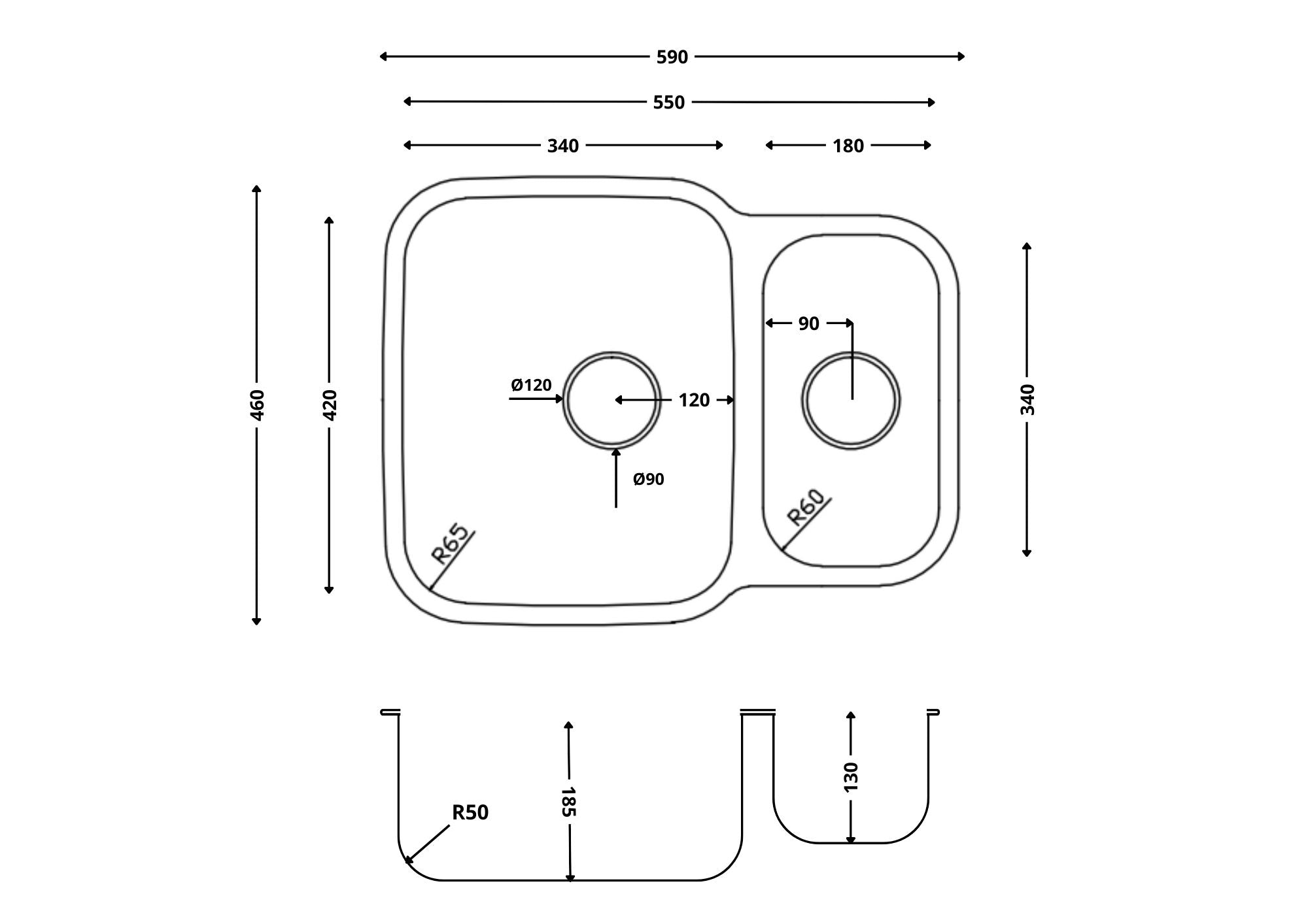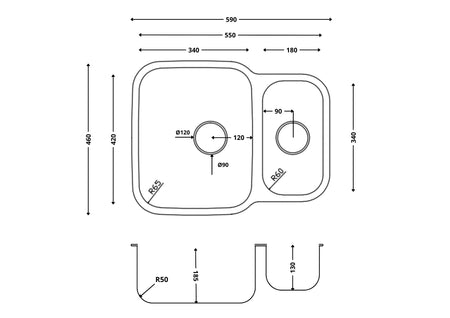 Kitchen Sink Type Undermount Kitchen Sink Length 590mm Kitchen Sink Width 460mm Main Bowl Length 340mm Main Bowl Width 420mm Secondary Bowl Length 180mm Secondary Bowl Width 340mm Bowl Arrangement 1.5 Bowl Waste Size 90mm Included Waste, Overflow Kitchen Sink Tap Holes 0 Bowl capacity 15.7 Litre Handed Left Handed Shape Rectangular Material Stainless Steel