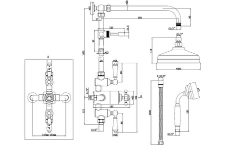- Adjustable rail with 200mm brass showerhead