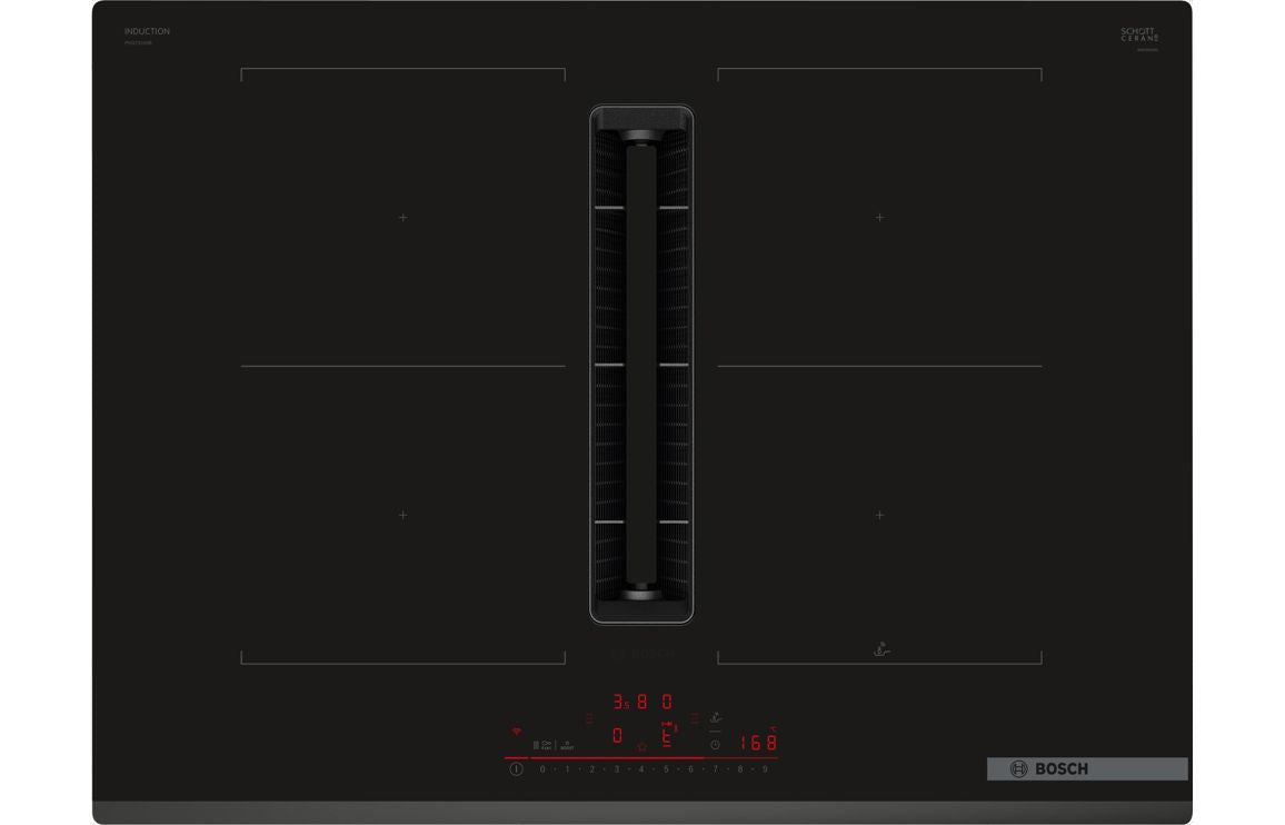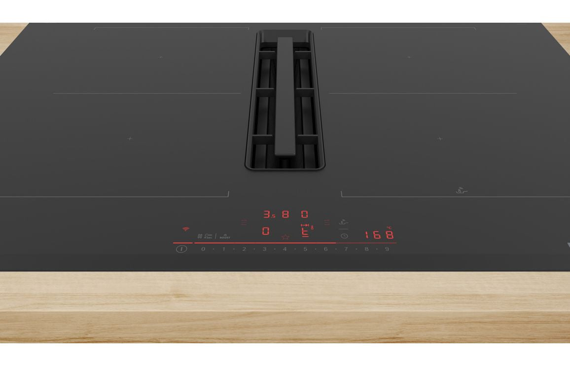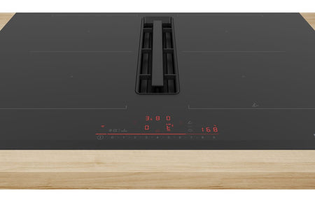 Upgrade your kitchen with this premium Bosch venting induction hob, combining powerful induction cooking with integrated extraction for a sleek, modern finish. Designed to fit seamlessly into your worktop, it removes steam and cooking odours directly at the source—eliminating the need for an overhead extractor.