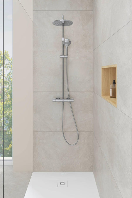 - The thermostat cartridge ensures a constant water temperature, even with fluctuating water pressure. Scope of delivery: chrome shower system, installation instructions