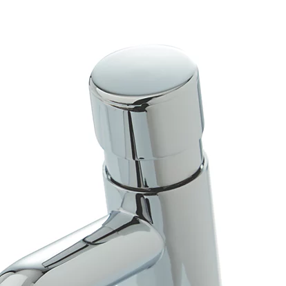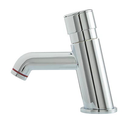 Non-concussive, self-closing tap for controlled handwashing. Push the button to turn on the flow and for automatic closing. Timer screw, hidden under the handle cover, allows the installer to adjust the cut-off time (4-13 seconds at 2bar pressure). Supplied with both red and blue silicone rings.