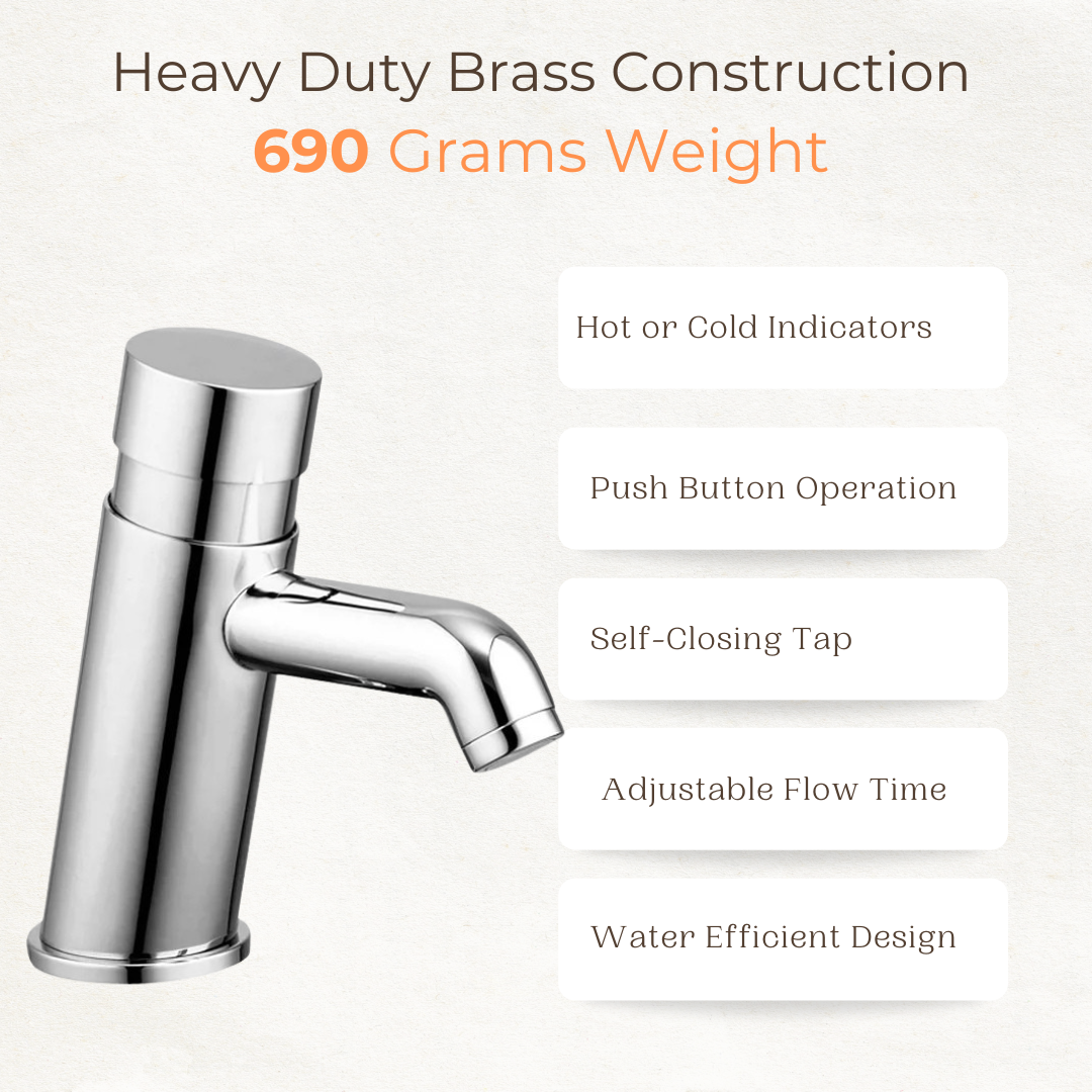- Push-button tap with self-closing mechanism for efficient handwashing; shuts off automatically to reduce water wastage and improve hygiene.