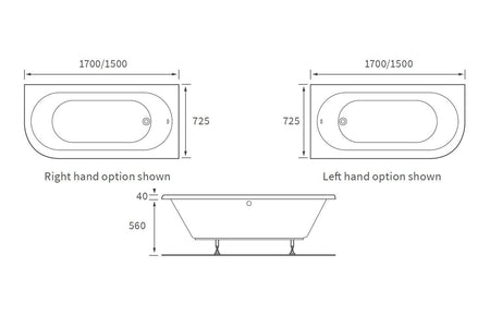J Shape 0TH Back to Wall Corner Bath with Legs – 725mm Wide, Modern Acrylic Design