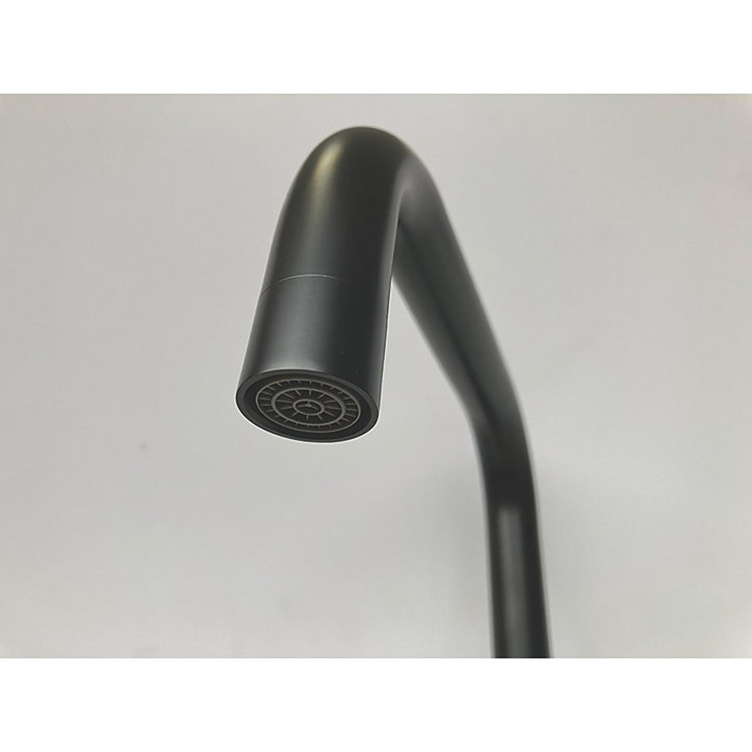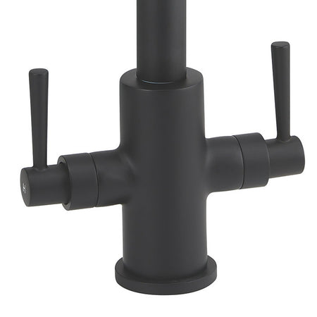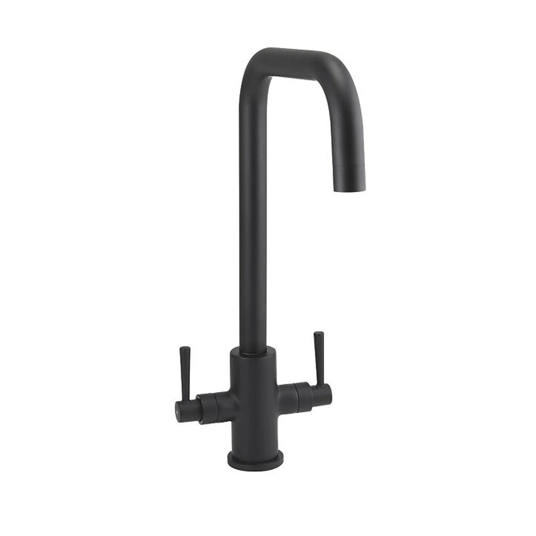 Deck-mounted twin lever kitchen mixer tap with plated matt black finish. Features swivel spout, tapered control handles, and built-in aerator for soft water flow.