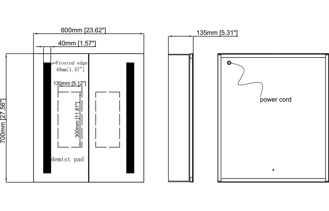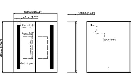 - Dimensions (mm): 700x600x135, EAN: 5054913483486, Guarantee: 2 Years, Brand: Excel Home, Range: Sacura, Demister Pad: 130x300mm per door, Dimmable: No, Demister: Integrated, IP Rating: IP44, Lighting: LED, Color: Cool White (6500K), Operation: Infrared Sensor, Type: Front-Lit Mirror Cabinet