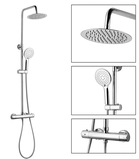 Thermostatic Shower Mixer Set Valve Round – Telescopic Shower with Diverter, 2 Outlets, Overhead & Hand Shower, Adjustable Height, Easy Clean Nozzles, Slim Head - Chrome